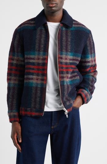 A woolly texture enhances the warmth of this sporty front-zip bomber covered in polished checks.