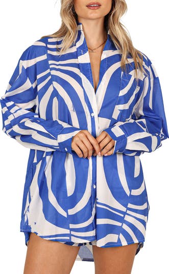 A bold allover print enhances the fashion-forward look of a contemporary button-up shirt cut from breathable cotton in a comfortably oversized fit.