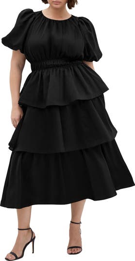 Crisp layered ruffles enhance the fluttering movement of this charming midi framed by charming puff sleeves.
