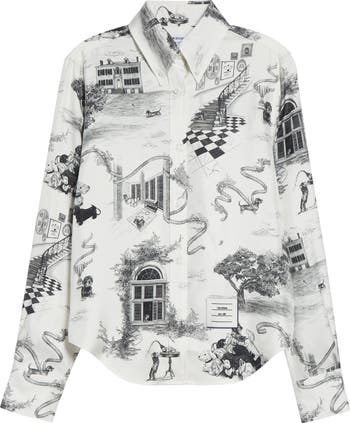 In celebration of Hector’s tenth year as a brand icon, this silk twill shirt from the resort '26 lookbook features a highly personal tableau that is part portrait, part pastoral dream. The print draws elements from Thom Browne’s own upstate world, depicting the beloved dachshund in a series of whimsical vignettes across the shirt tailored in an easy fit. Tricolor grosgrain peeking out from the back collar brings a signature brand touch.