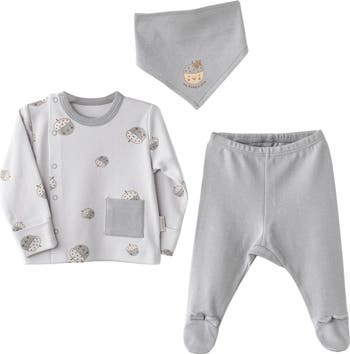 A cozy trio inspired by forest charm, perfect for snuggly days and gentle adventures. Light gray top with allover hedgehog print, side snaps, and front pocket for easy wear. Coordinating footed pants with elastic waist for all-day comfort. Matching bib with “My Friend Fox” motif adds a playful finishing touch.