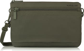 Tonal hardware and a water-repellent design distinguish a slim crossbody bag fashioned with RFID technology for an extra layer of electronic protection.