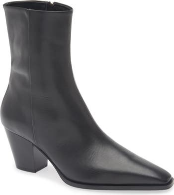 A snip toe furthers the streamlined profile of an Italian-made boot shaped from rich leather and lifted by a chunky, stacked heel.