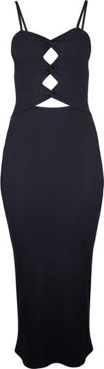 MADE IN THE USA Cutouts are called out at the top of the trend report, and this slinky knit dress serves them up with a leg-baring side slit. FABRIC 95% TENCEL™ Modal/ 5% Spandex Super soft and silky ribbed fabric Added stretch for structure and the perfect, most flattering fit FIT Spaghetti straps Midi length Side slit on one side Unique cut out front design Modeled in size XS Masha's Measurements: Height 5'9.5"/176cm Waist 26"/66cm Hip 36.5”/92cm Bust 32.5"/82cm Size Guide