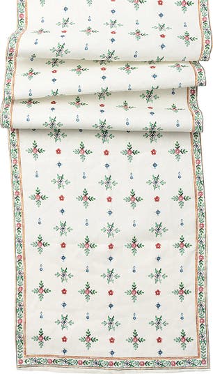 Folkloric floral motifs in a painted effect brighten your table on this runner crafted from fine linen.