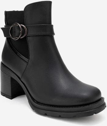 A modern buckled block-heel boot that balances structured style with reliable comfort