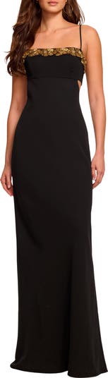 Beaded blooms instantly accessorize a seriously slinky gown accented in sultry cutouts and cut to skim every curve.
