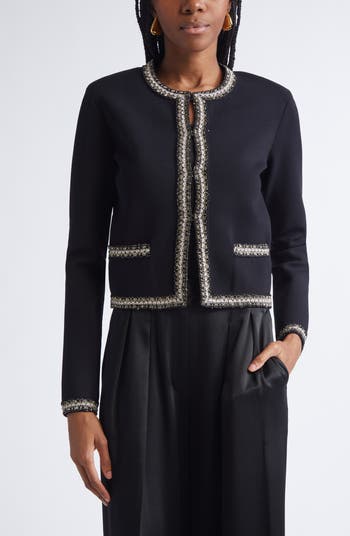 Sparkling passementerie trim brings an opulent finish to this boxy cropped jacket fashioned from the label's structured yet stretchy Santa Roma knit.
