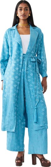 Meet Helen- a midi jacket jacket designed for options. Wrapped in a festive blue fabric featuring long sleeves finished with a cuff detail with a single button closure, side pockets, and collar. Offering full adjustability with the wrap waist tie design. On either side of the jacket, holes can be found to thread the ties as desired.