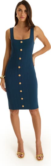 The Helena Button Dress combines elegance with effortless style. Sculpted knit fabric features strategically placed lines that flatter your silhouette while the embossed gold dome buttons add a refined touch. Designed for warm-weather comfort, this dress transitions seamlessly from day to evening.