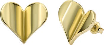 Sweet heart shapes with a slight bend in the center create a fluttery effect on stud earrings that bring pure romance to your lobes.