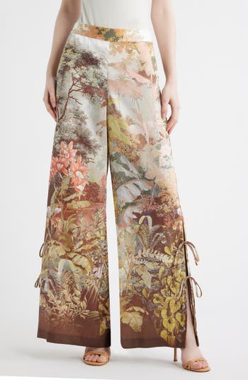 Dainty ties tether the hems of these flowery high-waist pants punctuated with drapey wide legs.