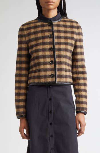 One of the checkered motifs peppered through the label's fall' '25 lookbook grids off this boxy, cropped jacket traced in rich leather and kissed with luxe wool, alpaca and cashmere fibers.