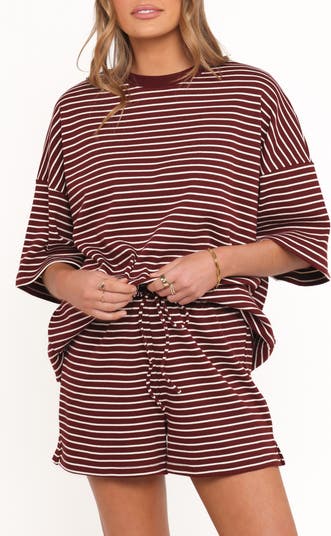 Keep it cute and cozy this season with a striped knit set that features a roomy top and drawstring shorts that look great worn together or separately.