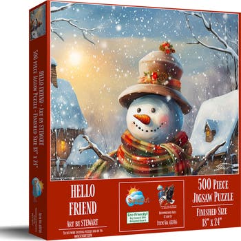Bring the magic of the holiday season into your home with the enchanting Hello Friend 500 piece jigsaw puzzle by SunsOut Inc. Perfectly sized at 18" x 24", this delightful winter wonderland scene captures the heartwarming essence of Christmas, perfect for adults and puzzle enthusiasts alike. Crafted robustly with interlocking pieces from high-quality recycled cardboard in the USA, each SunsOut puzzle promises a smooth and satisfying experience. Demonstrating an eco-friendly craftsmanship, SunsOut uses soy-based inks and recycled-board construction. Precision-cut pieces provide the perfect fit, bring the vibrant, fully-licensed artwork to life. Confident in their product, SunsOut puzzles come backed by a worry-free guarantee, further reflecting their customer-first approach and pride in being a woman-owned small business. This festive Hello Friend puzzle is not just a pastime but an invitation to create lasting holiday memories with loved ones, whether enjoyed by the fireplace or given as the perfect Christmas gift. A beautifully displayed puzzle, Hello Friend brings a touch of magic to cozy nooks or serves as a thoughtful gift, offering a heartwarming experience that resonates throughout the season. Experience the joy and wonder of the season with SunsOut.