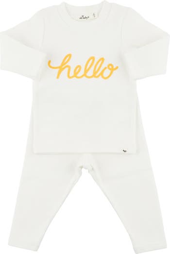 Surprise your loved ones with this playful, oh-so-cute two piece set! Perfect for revealing your pregnancy or bringing baby home in style. The long sleeve tee features a golden embroidered "hello", while the coordinating pants complete the look. Keep your little one stylish and comfortable in this ensemble. Available in infant sizes. Designed in Minnesota.