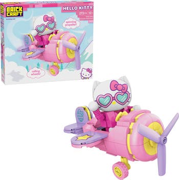 - Bright and cheerful brick-built airplane design featuring Hello Kitty in her heart-shaped sunglasses and signature pink bow