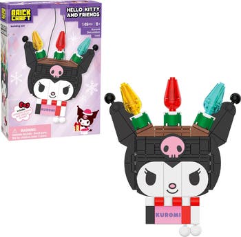 Kuromi shows off her mischievous holiday style in this brick-built decoration featuring her black jester hood, pink skull emblem, and festive holiday lights. Printed eyes and cheeks capture her bold expression, while a striped scarf and nameplate base complete the design. With a stand and hanging string included, this playful build can be displayed on a desk, mantel, or holiday tree, bringing Sanrio's cheekiest character into your seasonal decor.