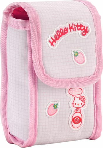 Specially designed to complement the Hello Kitty Strawberry Kawaii FC-11 film camera, this 35mm camera bag is flexible enough to accommodate many different types of point-and-shoot cameras and/or other small goodies. Built from a durable white textile covered in a pink grid and trimmed with pink piping, the bag has a hook-and-loop closure and is lined with a plush, deep-pink interior. Proudly displaying a variety of Hello Kitty strawberry-themed graphics, this camera bag has a buttonable belt strap and external D-ring ready for a strap, clip or carabiner.