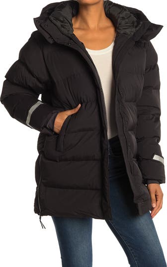 - - Stand-up collar with attached hood - Long sleeves - Front hidden zip closure with exterior snap-button placket - 2 front welt pockets - Quilted construction - Lined - Approx. 35" length (size S) - Imported This item cannot be shipped to Canada.