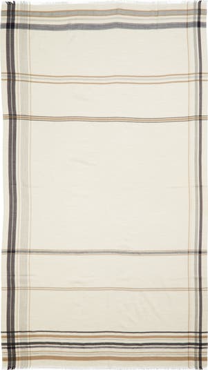 Produced at a centuries-old Scottish mill, this striped scarf makes layering feel ultraluxe with its lofty, lightweight cashmere yarns and wispy eyelash fringe.