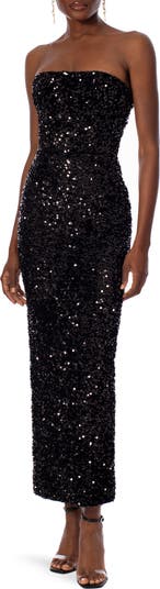 Sparkling sequins lend festive shine to a shoulder-baring gown accented with a back skirt slit for fluid movement.