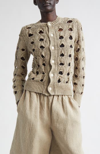 Rei Kawakubo brings a roughened and distressed feel to this chunky cardigan knit with irregular open stitches from rustic hemp yarn for a thoroughly organic aesthetic.