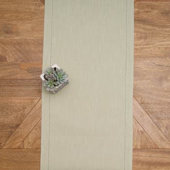 Bring clean structure and seasonal versatility to your tabletop with this green hemstitch solid table runner. Crafted from 100 percent cotton, this runner offers a soft yet durable surface that lays smoothly across dining tables, kitchen islands, buffets, and console tables. The tailored hemstitch edge adds subtle stitched detail that elevates the look while maintaining a classic and timeless presentation. The solid green color transitions easily through multiple seasons, making it suitable for spring refresh styling, everyday dining, festive winter tables, and Christmas entertaining. Measuring 14 x 72 inches, it provides balanced coverage for most standard tables without overpowering your place settings. It works beautifully as a standalone centerpiece base or layered with placemats, candles, greenery, and serving pieces for coordinated tabletop displays. The cotton construction supports repeated seasonal use and is machine washable for simple upkeep after hosting and family gatherings. Whether styled casually or as part of a full holiday tablescape, this runner delivers reliable function, clean visual structure, and year round decorating value.