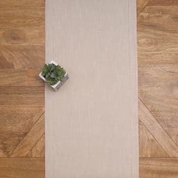 The Hemstitch Solid Tan Cotton Table Runner is a timeless tabletop accent designed to bring warmth, balance, and versatility to your home decor. Crafted from 100 percent cotton, this cloth runner offers a soft natural texture with dependable structure, allowing it to drape smoothly across dining and kitchen tables. The solid tan color provides a neutral foundation that pairs effortlessly with a wide range of seasonal decor, from fresh spring centerpieces and bright summer florals to winter greenery and classic Christmas displays. Subtle hemstitch edging adds refined detail without overpowering the overall look, making this runner suitable for both everyday dining and elevated entertaining. Measuring 14 inches by 72 inches, it is sized to fit most standard tables while leaving room for layered place settings and decorative accents. Whether styled on its own or layered with placemats and chargers, this runner enhances visual depth while protecting the tabletop surface. Its adaptable design makes it a reliable decor staple that transitions easily throughout the year and across a variety of home styles. It also serves as a tasteful holiday or housewarming gift.