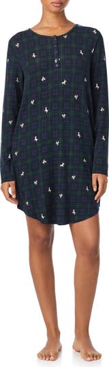 Lounge a bit longer in the soft, cotton-blend comfort of this henley-style sleepshirt covered in a heritage plaid print.