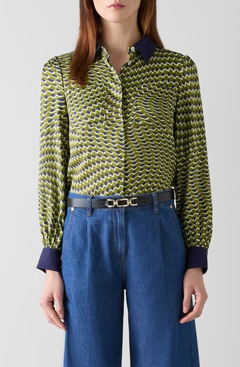 A mesmerizing geo print enlivens this smooth and polished shirt made with solid trim for contrast.