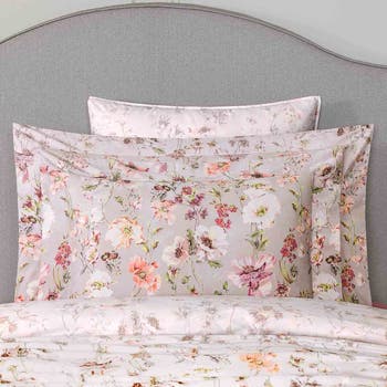 - The reverse side of pillowcases is decorated with garden flowers in muted colors as if in blurred watercolors and with wide borders on the three sides
