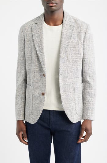 Richly textured tweed knit from cotton, linen and silk relaxes the formality of a sport coat tailored with softly constructed shoulders and a traditional fitted waist. Lightweight and partially lined, it makes a versatile complement to your semiformal and warm-weather wardrobes.