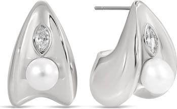 The luster of freshwater pearls plays against the sparkle of faceted cubic zirconia as the nestle in the arcing curves of these sculptural huggie earrings.