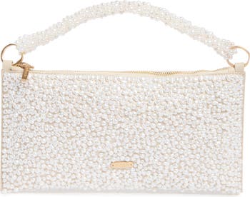 Lustrous imitation pearls underscore the glamorous appeal of an evening-ready bag designed in a slender profile for easy wear.