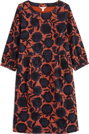 Warm organic cotton corduroy fabric gives this floral dress cozy appeal, while the darts at the bust and subtle tucks at the waist create a gently flared silhouette.