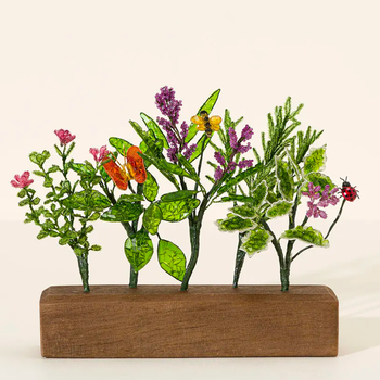 Celebrate summer's bounty with this cheery herb bed, sculpted from shimmering fragments of recycled glass. Light- and eye-catching herb blossoms and insect friends add lively to the brilliant foliage. The artful culinary stars have symbolic meanings: thyme courage, basil protection, lavender devotion, rosemary love, and oregano joy. The herbs are firmly planted on a handsome alderwood base. Handmade in the Philippines.