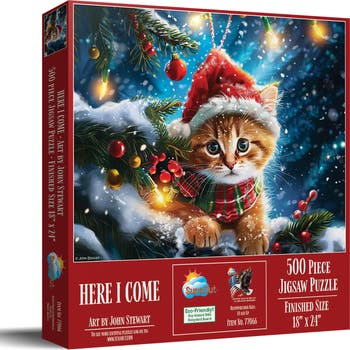 Indulge in the holiday charm with the "Here I Come" 500 piece jigsaw puzzle by John Stewart and SunsOut Puzzles. This heartwarming scene, filled with Christmas cheer and holiday magic invites warmth andjoy into your home, whether you're creating new traditions or reflecting on cherished ones. Proudly made in the USA, each SunsOut puzzle piece is crafted from high-quality recycled cardboard, ensuring durability and a perfect fit. The company's eco-friendly approach includes using soy-based inks and recycled materials, ensuring you can enjoy the fully licensed whimsical artwork guilt-free. Once completed, this eye-catching 18" x 24" scene of a playful holiday-decorated kitten becomes an ideal piece of cherished holiday décor for display. SunsOut, a woman-owned business, takes pride in their products and stands behind them with a worry-free guarantee, attributing utmost importance to both exceptional quality and customer service. Enjoy the blend of Americana and heartwarming animal charm this jigsaw puzzle offers and let the enchanting scene by John Stewart bring joy and nostalgia to your puzzle journey. This fulfilling adventure of piecing together the "Here I Come" jigsaw puzzle by SunsOut transforms quiet moments into treasured memories.