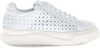 Bold perforations lined with mesh highlight the sides of this airy sneaker set on a wavy corrugated rubber sole.