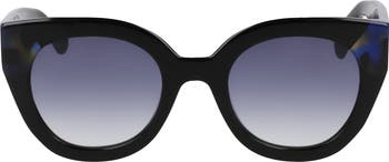 A retro-chic silhouette brings throwback style to scene-stealing sunglasses agleam with logo-etched accents at the temples.