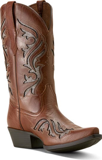 Classic Western style meets modern comfort in this cowgirl-glam boot made from full-grain leather with glittery underlays that shimmer through the laser cutouts. Traditional two-row flame topstitching and a dress heel amp up the rodeo-ready vibes, while the cushioned insole and ergonomic support ground the style in all-day comfort for weddings, festivals, bachelorette weekends, game days and every day in between.