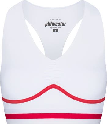 Soft, medium-support sports bra with a smooth stretch feel, ruched bust detail, racerback design, and vintage contrast banding. Pairs with the Heritage Skirt.