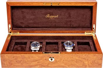 These solid wood, handcrafted five watch collector box each have a Burr Walnut or Macassar veneer finish. The exterior is finished with layers of hand applied lacquer to give it a luxurious lustre. The hinges together with the lock and key are gold plated and the interior is finished with a matching suede lining. The watch cushions are adjustable to fit large and smaller watches.