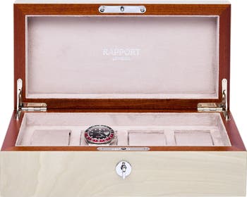 The Heritage Watch Box is made up of rich colours with a sleek handcrafted design. A classic stain finish is applied with layers of lacquer for exquisite lustre, with a matching suede lining. The box is tailored to store and protect four individual watches, with each watch cushion designed with flexibility to be able to accommodate different watch sizes.