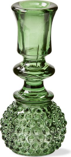 - Heritage Hobnail Green Glass Taper Candle Holder is 7 inches tall and made of high-quality green glass, designed to hold standard size taper candles and tea lights.