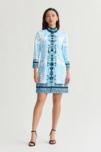 Sophisticated and chic, the Heritage Lined Printed Stretch Deco Crepe Jacket features a delicate filigree pattern in a striking blue and white palette, perfect for special occasions. Designed with a stand collar and bracelet-length sleeves, it offers a flattering silhouette. Fully lined and structured, it pairs beautifully with the matching dress or an all-white ensemble for a polished, coordinated look.