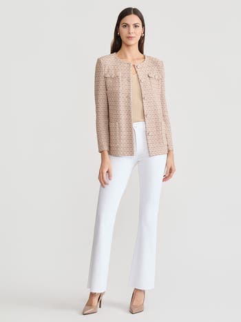 This tonal tweed knit jacket is a refined essential for polished spring workwear and wedding guest occasions, blending timeless texture with modern ease. Designed with elegant pearl button detailing and a flattering silhouette, it delivers a sophisticated finish that elevates both dresses and coordinating separates. Ideal for the office, spring events, and special celebrations, this jacket offers luxury versatility, structured comfort, and season-ready style.