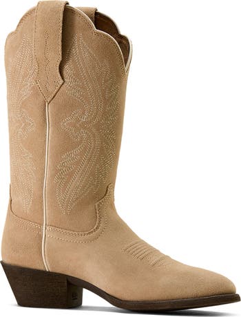 A scalloped topline balances the tonal embroidered detailing on the shaft of a Western boot outfitted with a classic setback heel.