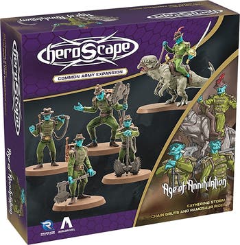 HEROSCAPE: CHAIN GRUTS & RAMOSAUR RIDER ARMY EXPANSION - For millennia, the planet Grut was a wild, untamed wilderness. But millennia are meaningless in the Battle of All Time. In time, the orcs of Grut, having harnessed the power of industry, it attracted the attention of the Valkyrie Volarak. Now, those who speak ill of Volarak’s regime sometimes find themselves having a difficult conversation with some Chain Gruts, their door having been smashed in by an ornery Ramosaur. Those conversations either end amicably… or with the revving of a chain axe! This expansion includes one 4-figure Common Squad and a Common Hero. The highly detailed, pre-assembled miniatures and 2 Army Cards are fully compatible with all Heroscape Battle Boxes, Master Sets, and Expansions. Get ready to charge onto the battlefield with the Ramosaur Rider, smashing enemy lines with devastating speed, and the Chain Gruts fighting in perfect coordination with their champions. Unleash the fury of Grut! The Chain Gruts swarm with Guild Boss Bonding and re-rolls using their Chain Axes, locking enemies in place. The Ramosaur Rider charges in with crushing attacks and their bone-shaking Headbutt. Add multiple of these fierce Common Squads and Common Heroes to your army to overwhelm your foes! Fully compatible with all Heroscape Battle Boxes, Master Sets, and Expansions. Requires a Heroscape Battle Box of Master Set to play. Heroscape: Chain Gruts and Ramosaur Rider Army Expansion - 2 players - Ages 14 and up includes two 3-figure Common Squads and 2 Army Cards - Requires a Heroscape Battle Box of Master Set to play. Compatible with all Heroscape releases