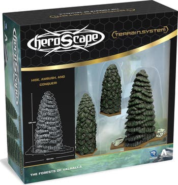 FORESTS OF VALHALLA TERRAIN EXPANSION - Bring the wilds of Valhalla to your tabletop with the Forests of Valhalla Terrain Expansion. Towering evergreens provide natural cover, block line of sight, and create ambush opportunities as your armies navigate dense woodland battlefields. Perfect for staging surprise attacks or fortifying defensive positions, these highly detailed trees add both tactical depth and visual impact to your Heroscape maps. Fully compatible with all Heroscape Master Sets and Expansions. Shape the Battlefield with dense tree coverage to change line of sight, forcing players to adapt their strategies and movements. Use the forest to hide troop movement or create strong defensive positions. Highly detailed evergreen trees add dramatic height and realism to your battlefields. Fully compatible with all Heroscape Battle Boxes, Master Sets, and Expansions. Requires a Heroscape Battle Box of Master Set to play. Forests of Valhalla Terrain Expansion - 2 players - Ages 14 and up includes 6 Evergreen trees of various hex sizes for use with Heroscape and all hex-based miniature games. Requires a Heroscape Battle Box of Master Set to play. Compatible with all Heroscape releases